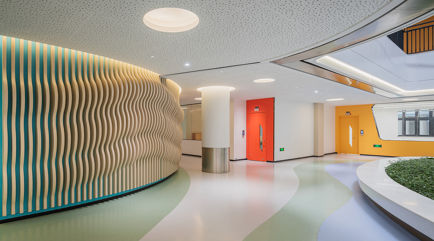校園環(huán)境關(guān)乎著每一位孩子的身心健康,因此,學(xué)校建設(shè)更應(yīng)嚴(yán)格強(qiáng)調(diào)工程質(zhì)量的安全環(huán)保。對(duì)于這一方面,港源裝飾與甲方的意見高度統(tǒng)一,因此仿木紋金屬墻面便成為亮亮中學(xué)室內(nèi)環(huán)境的重要材質(zhì)。仿木紋金屬墻面不僅有極佳的質(zhì)感,而且具備環(huán)保、防潮、抗菌等優(yōu)勢(shì),但金屬材質(zhì)易變形的屬性也同時(shí)存在。為了堅(jiān)持環(huán)保優(yōu)先原則,港源裝飾團(tuán)隊(duì)反復(fù)論證,決定增加輕鋼龍骨等基層處理工序來保障金屬墻面的平整度及垂直度,并且達(dá)到了易于拆裝、降低維護(hù)成本的目的。